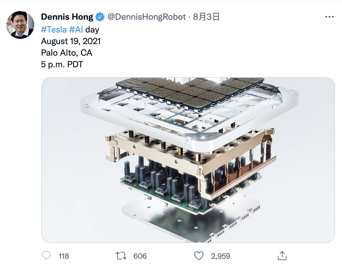 Two days before Tesla released the invitation, Dennis Hong, an expert in autonomous driving, had posted the image on his Twitter account and tagged it with Tesla AI Day.