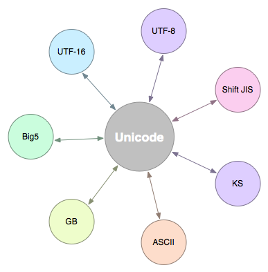 As you can see from the above diagram, different byte encodings can be converted to each other by Unicode.