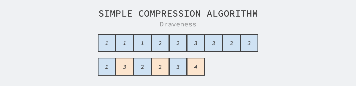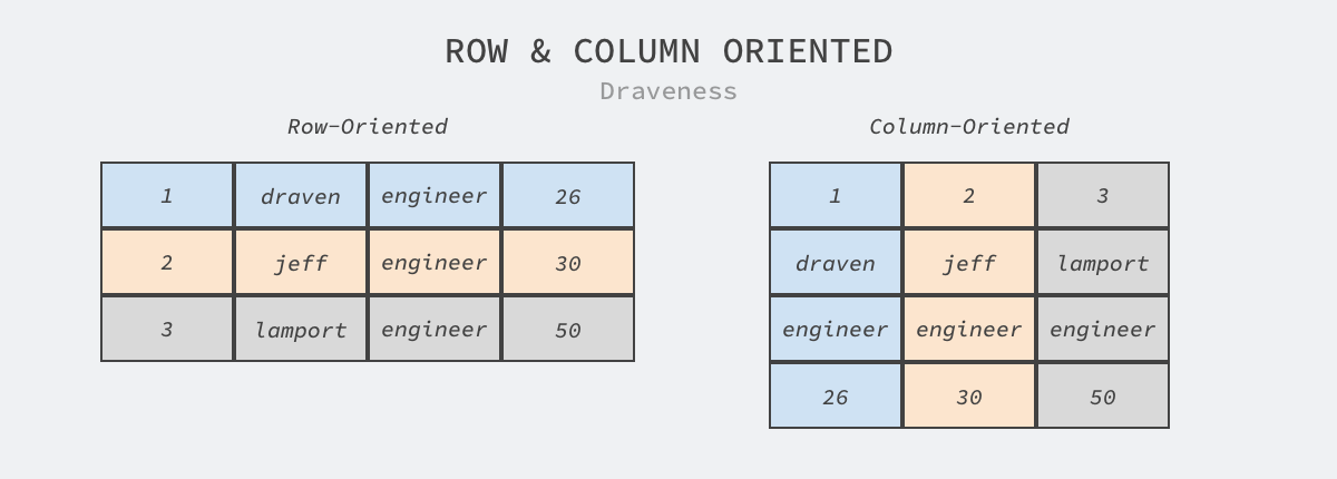 All the yellow squares in the above figure indicate the number of repetitions of the preceding string. This simple compression strategy can compress the length of the string by 33% with no loss, but the compression rate is determined by both the compression algorithm and the characteristics of the data. Compared to row-oriented data storage, column-oriented data storage stores the same type of data in close proximity, which gives more room for the compression algorithm to play.