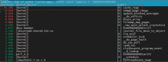 perf is an essential tool for cpu usage anomalies. Looking at hotspot functions via perf top, we find that the kernel function cache_reap has intermittent high usage.