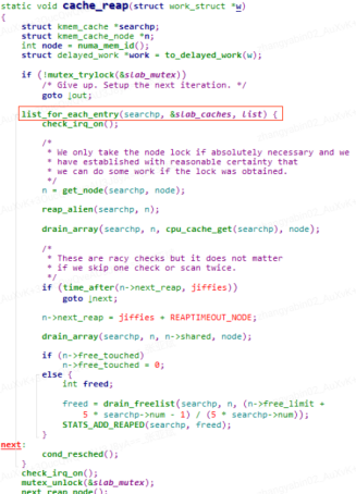 It is easy to see that this function iterates through a global chain of slab_caches, which records information about all slab memory objects on the system.