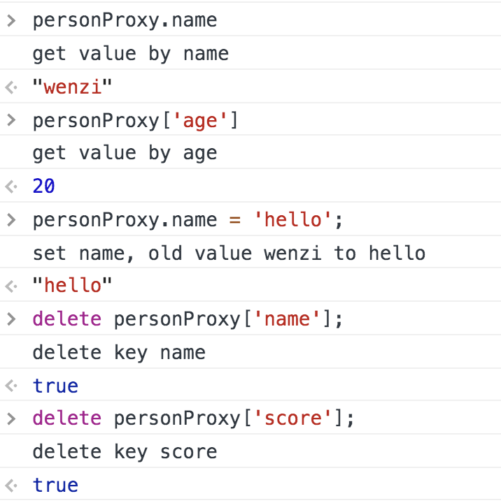 The Proxy is just a proxy, the personProxy has all the properties and methods of the person. When we get and set the name through personProxy, there will be a corresponding log output.