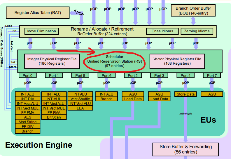 Or let’s look at an actual Intel Skylake architecture scheduler. The red circle in the diagram is the scheduler responsible for “firing” instructions per cycle.