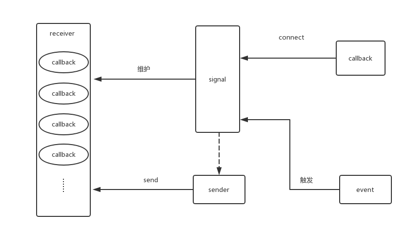 Django implements a Signal class, which is used to implement the function of “signal dispatcher”. The working mechanism is shown in the figure below, which is divided into two parts: first, each callback function that needs to be dispatched is registered to signal, and second, the event triggers sender to send the signal.