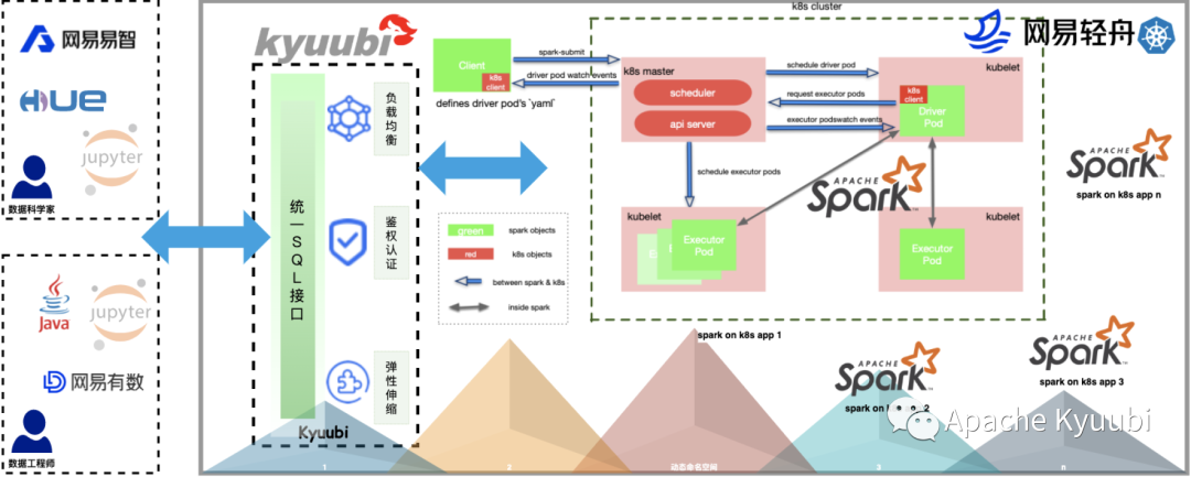 In terms of spark-submit, the traditional way of submitting jobs, as mentioned in the previous article, can be easily submitted to k8s or YARN clusters by configuring isolation, which is basically as simple and easy to use. This approach is very user-friendly for users familiar with the Spark API and ecosystem, and there are basically no hard requirements for the k8s technology stack.