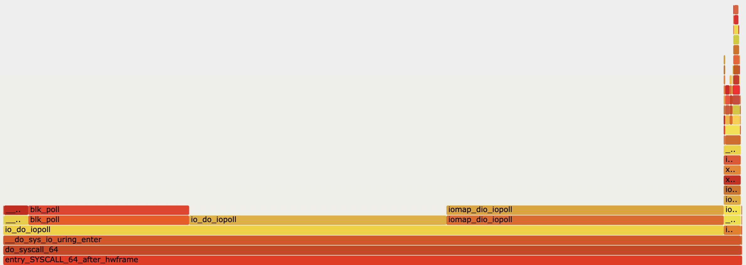 As you can see from the flame chart, io_uring_enter spends only a small fraction of its time on the task submission piece. Most of the time is spent polling for I/O operations to complete.