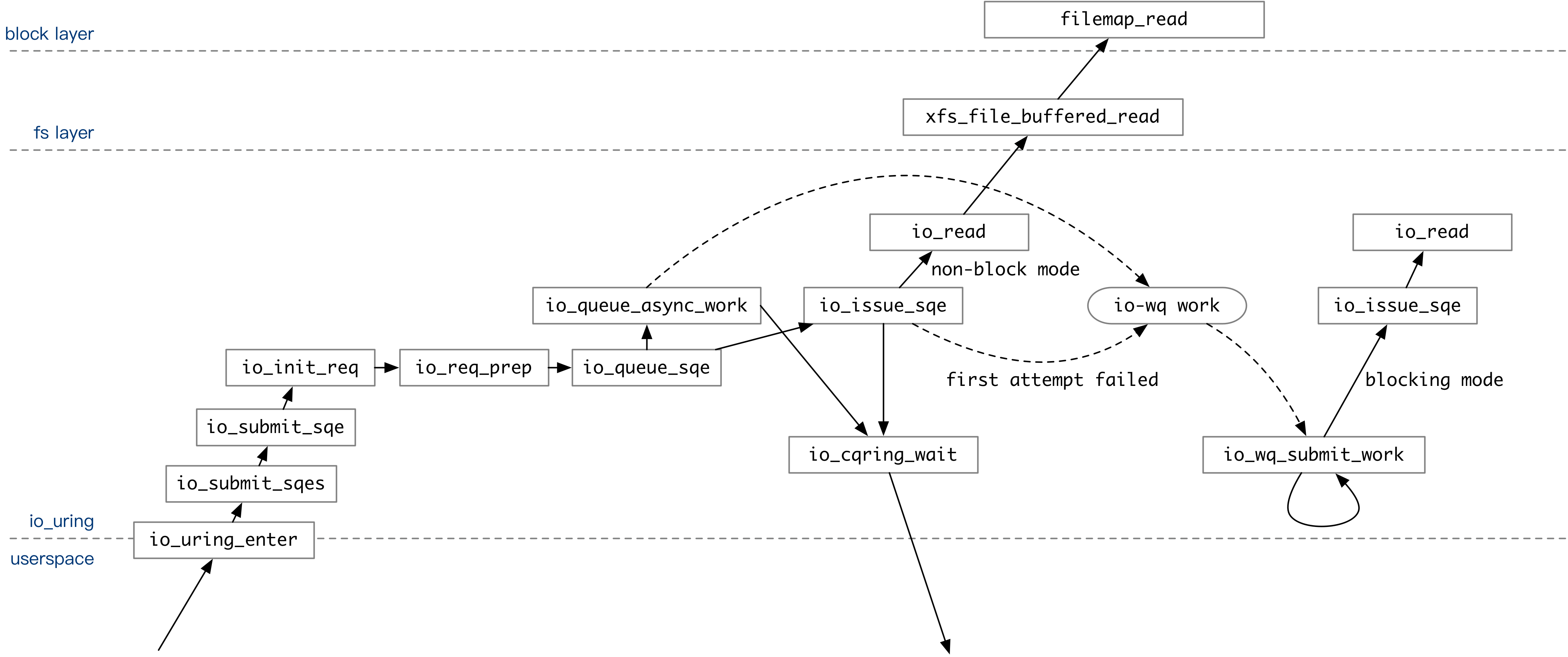 IOSQE_ASYNCoption is not specified,io_uringwill first attempt to execute the operation contained in the SQE once in non-blocking mode. For example, when executingio_read, if the data is already in the page cache, theio_readoperation in non-blocking mode will succeed. If it succeeds, it returns directly. If unsuccessful, it is put into io-wq.