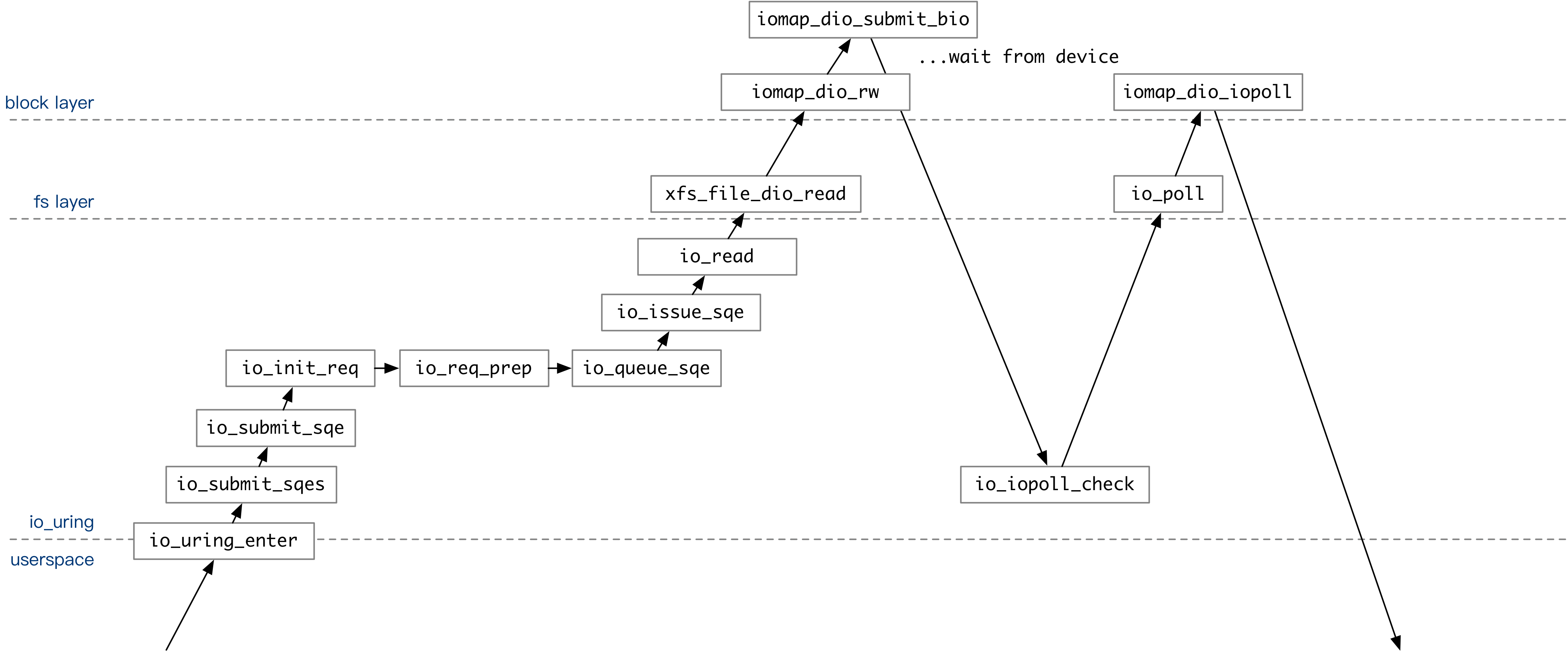 In polling mode, io-wq will not be used. When submitting tasks, io_read calls the kernel’s Direct I/O interface directly to submit tasks to the device queue.