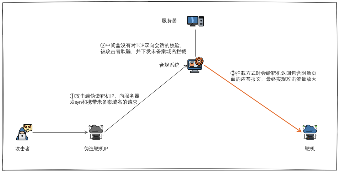 - many middleboxes intercept by returning a larger reply message containing a blocked page, the target machine receives a large amount of spam traffic, and eventually the hacker achieves a reflected amplification of the attack traffic.