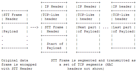 As shown in the figure below, the STT Frame Header (middle layer) and the MAC header, IP header, and TCP-like header (encapsulation layer) are added to the Payload before it is sent out. The NIC’s LSO mechanism will break the TCP packet into smaller pieces, copy the encapsulation layer and add it to the front of each piece before sending it out.