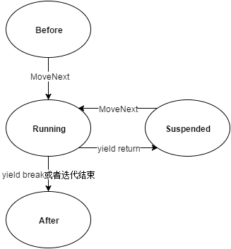 - Running is the state entered after calling MoveNext. In this state, the enumerator detects and sets the position of the next item. When yield return, yield break or end of iteration is encountered, this state is exited