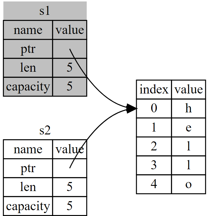 Borrowing from this diagram in the TRPL book, both variables s1 and s2 are allocated on the stack, and the string “Hello” is allocated on the heap, where the ptr field is a pointer to the string. move occurs when the compiler creates a new piece of memory on the stack, s2, and then copies the contents of s1 to s2 as is. and then copies the contents of the s1 stack to s2, immediately invalidating the original s1 memory.