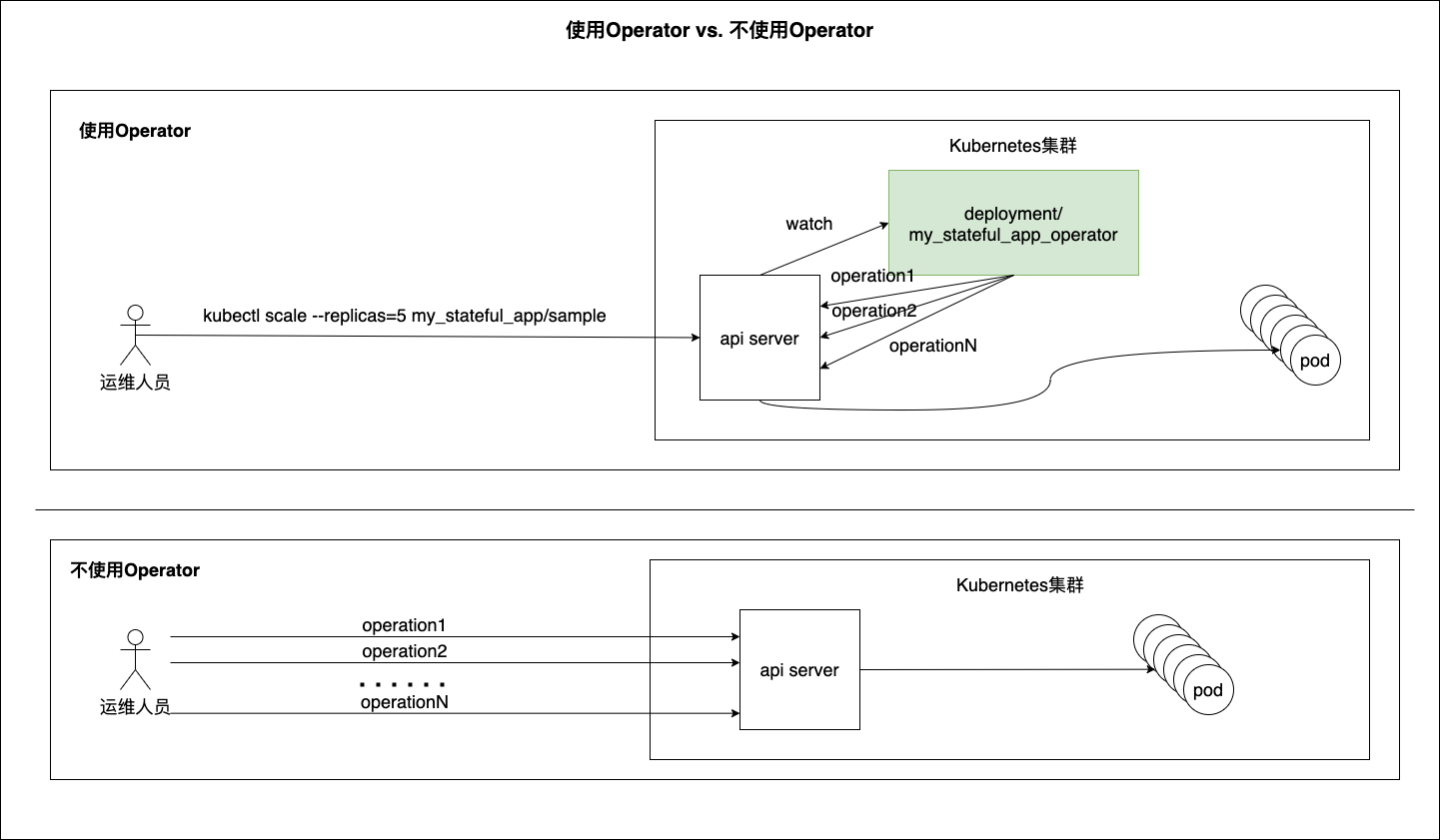 So what are the benefits of Operator? The following diagram compares the benefits of using Operator with those of not using it.