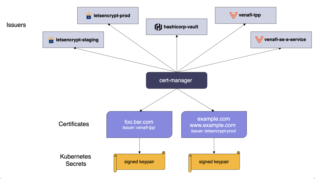 Cert-manager is a very popular cloud-native certificate management tool. Cert-manager adds certificates and certificate authorities to Kubernetes clusters as CRD resource types, simplifying the process of obtaining, renewing, and using these certificates. It can issue certificates from a variety of supported sources, including Let's Encrypt, HashiCorp Vault, and Venafi, as well as private PKI’s. It will ensure that certificates are valid and up-to-date, and attempt to update them at the configured time before they expire.