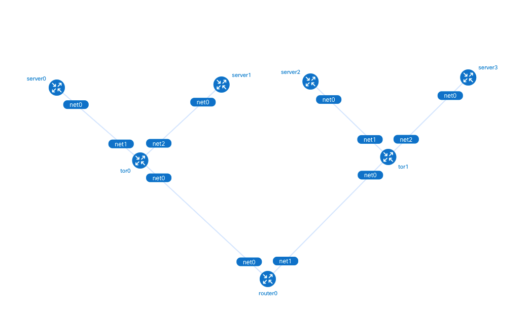 - router0, tor0, tor1 as network devices outside the Kubernetes cluster, set the network interface information and BGP configuration in the exec parameter. router0 establishes BGP neighbors with tor0, tor1, tor0 with server0, server1, router0, tor1 with server2, server3, router0.