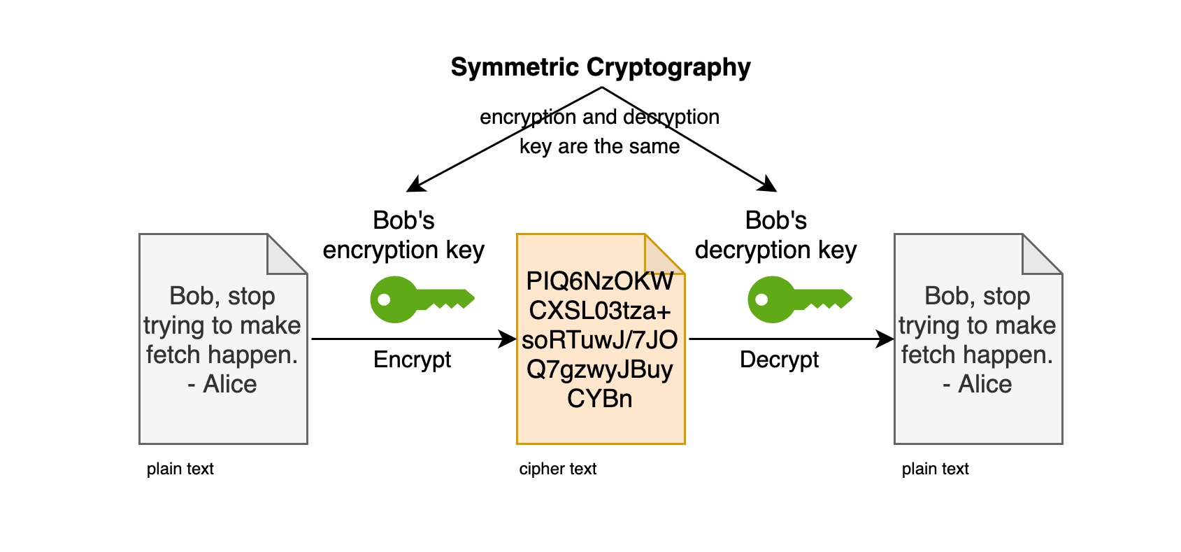 So, why is it called symmetric encryption? You can understand it this way: one party encrypts the message by the key and then passes the cipher text to the other party, and the other party decrypts the cipher text by this same key and converts it into understandable plain text. The relationship between them is as follows.